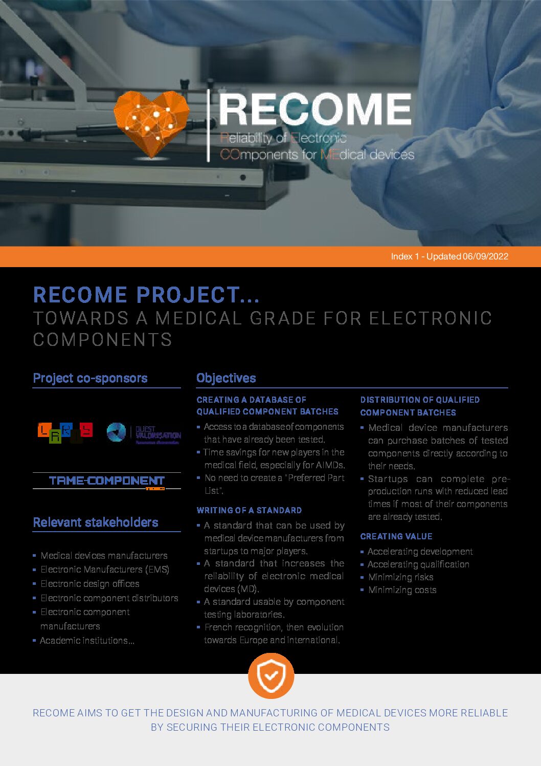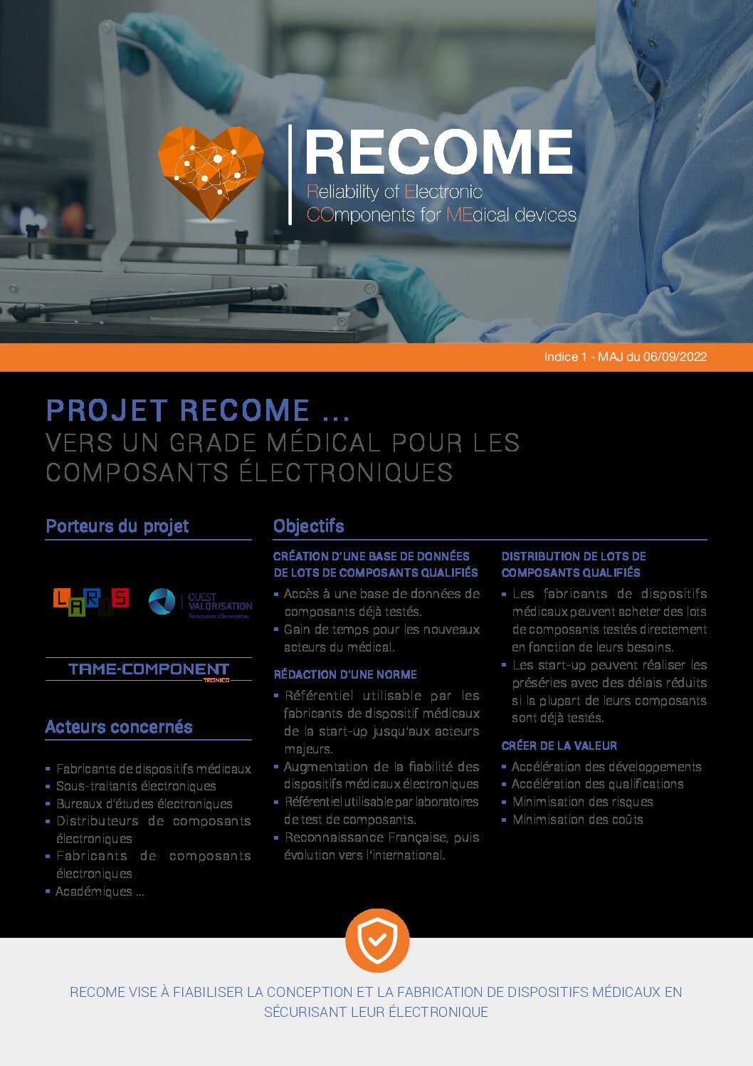 Tame-Component and the medical branch of TRONICO group, together with the LARIS and OUEST VALORISATION laboratory, have the ambitious project to create a standardized medical grade for electronic components named RECOME.